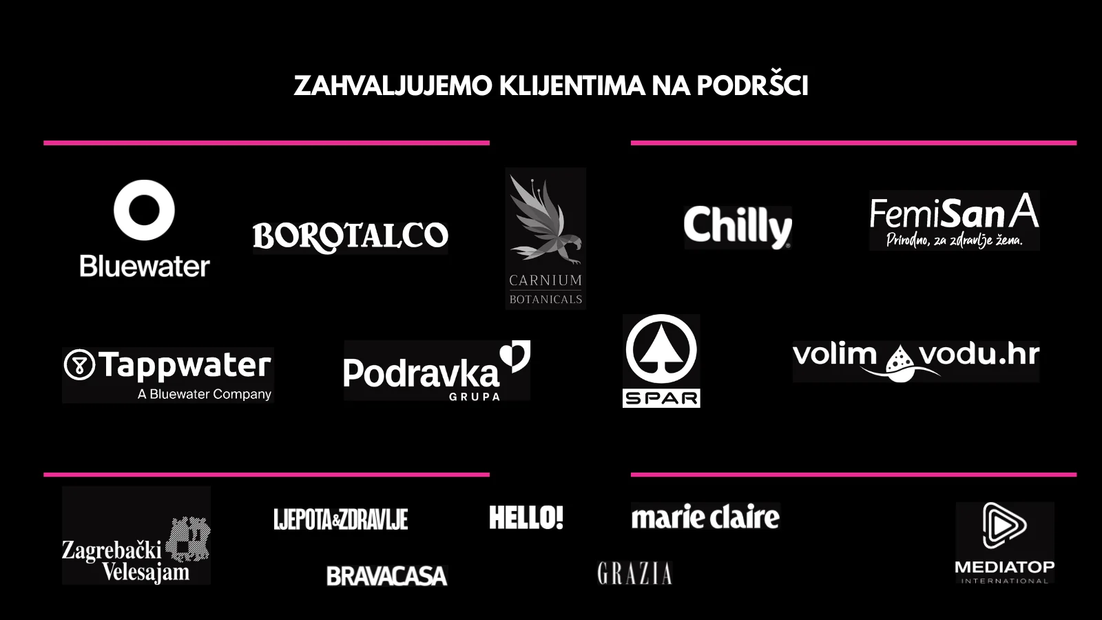 Posebna zahvala domaćinu eventa Beauty & Hair Expo – Zagrebačkom Velesajmu, kao i našim dragim prijateljima i partnerima projekta: Spar Hrvatska, Borotalco, FemiSan, Chilly, Podravka, Tappwater, Bluewater, volimvodu i Carnium Botanicals, na podršci, povjerenju i zajedničkom doprinosu uspješnoj realizaciji ovog događanja.