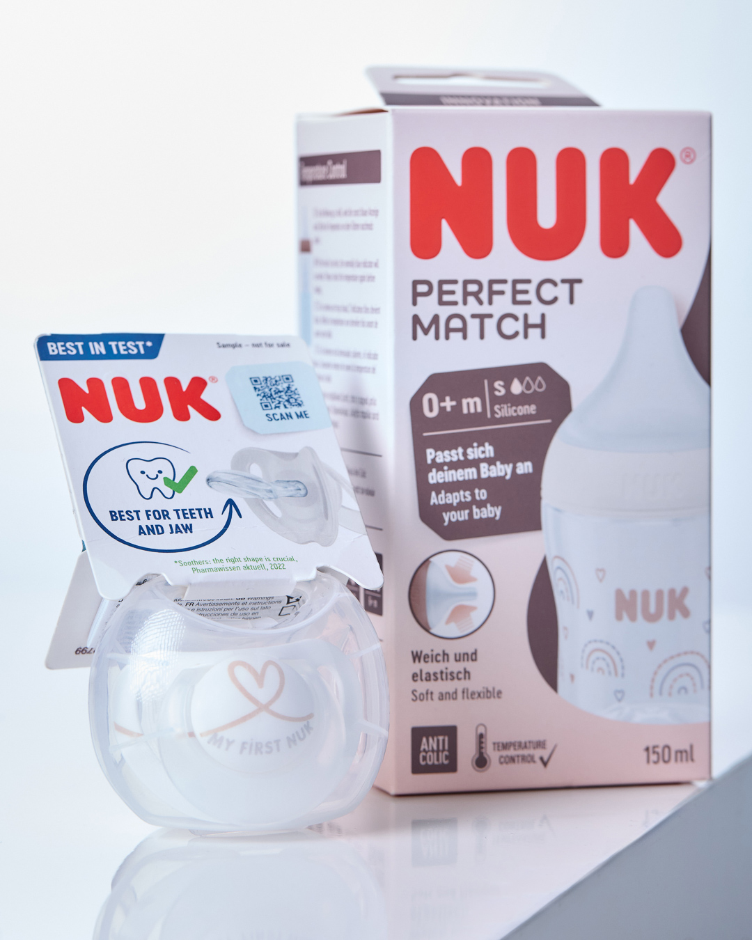 Paket uključuje NUK bočicu Perfect Match koja olakšava hranjenje, NUK silikon dudicu za mirne trenutke i spavanje, Emco Bling Bandz narukvicu, te Chicco upijajući jastučići za grudi koje su nezaobilazan dodatak. Savršen za roditelje koji žele spoj praktičnosti i kvalitete, ovaj paket donosi sve što je potrebno za mirne i zabavne trenutke s djetetom.