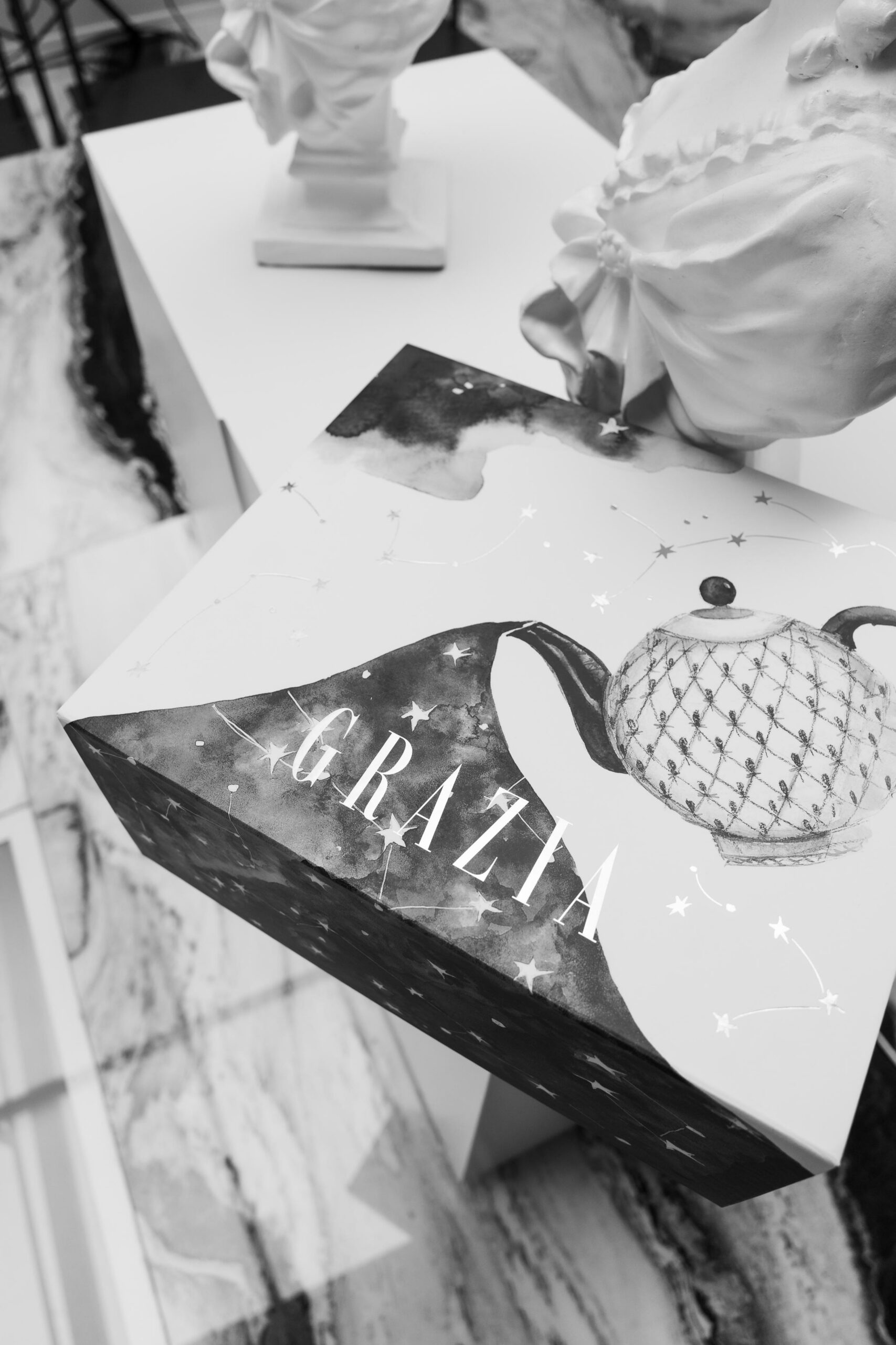 Dosadašnje adventske kalendare s kućicama ove smo godine podignuli na novu razinu i zamijenili ih kutijom velikih dimenzija, koja nosi umjetnički potpis Jasmine Kosanović. Hrvatska slikarica i ilustratorica poznata je po svojim sanjivim i bajkovitim vizualima, lutkicama i slikovnicama. Grazia Advent Box oslikan je karakterističnom tamnoplavom bojom i, baš kao mnogi Jasminini radovi, nosi sa sobom dozu nježnosti i nostalgije.